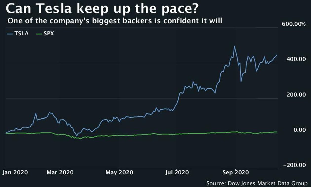 Ο δισεκατομμυριούχος επενδυτής, Ρον Μπάρον, αγοράζει μετοχές της Tesla εδώ και χρόνια και, αυτή τη στιγμή, κανένας δεν μπορεί να τον αδικήσει. Η μετοχή μέχρι στιγμής έχει ενισχυθεί πάνω από 400% φέτος και αν η πρόβλεψη του Μπάρον, ότι οι πωλήσεις της θα αυξηθούν σε ετήσια βάση κατά 50%, επαληθευτούν, τότε σίγουρα υπάρχει ακόμα μεγαλύτερο περιθώριο ανόδου.
