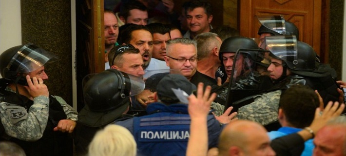 Ο ηγέτης του Σοσιαλδημοκρατικού Κόμματος Ζόραν Ζάεφ γρονθοκοπήθηκε και τραυματίστηκε ελαφρά μετά την εισβολή των διαδηλωτών στην αίθουσα.