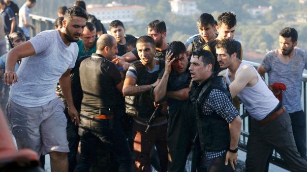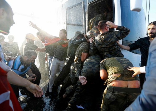 Στη γέφυρα του Βοσπόρου, όπου παραδόθηκαν μερικές δεκάδες στρατιώτες, έχοντας πρώτα αφήσει στο οδόστρωμα τα όπλα και την εξάρτησή τους, γνώρισαν τον θυμό των πολιτών. Κάποιοι από αυτούς τους χτύπησαν, άλλοι δεν δίστασαν να τους ποδοπατήσουν, ενώ χαρακτηριστική είναι και η φωτογραφία που μεταδίδουν τα διεθνή ΜΜΕ, με έναν άνδρα που μαστιγώνει στρατιώτες με μία ζώνη. Μάλιστα, σύμφωνα με πληροφορίες, λίντσαραν έναν στρατιώτη μέχρι θανάτου!