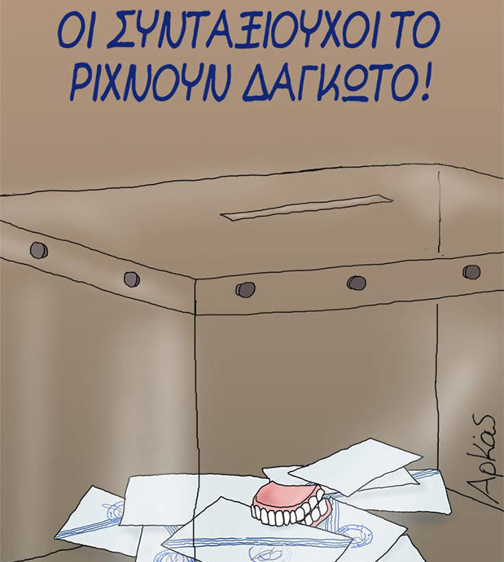 Στο δεύτερο σκίτσο, οι συνταξιούχοι ψηφίζουν «δαγκωτό»… κυριολεκτικά: