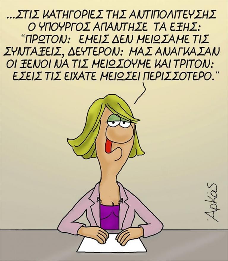 Το πρώτο του σκίτσο αφορά στην κυβερνητική προπαγάνδα με αντικρουόμενες δηλώσεις για τις περικοπές στις συντάξεις:
