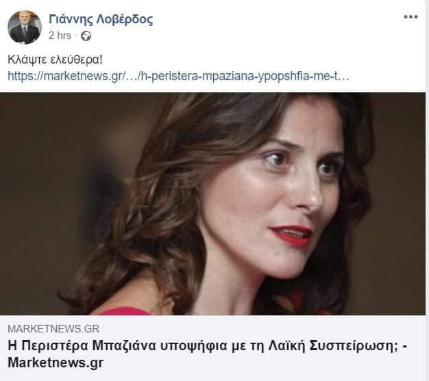 Ο δημοσιογράφος και υποψήφιος βουλευτής με τη Νέα Δημοκρατία ανέβασε την είδηση από το marketnews.gr, ότι η… Περιστέρα Μπαζιάνα θα είναι υποψήφια με τη Λαϊκή Συσπείρωση. Και σε αυτό το δημοσίευμα υπήρχε η σύντροφος του Τσίπρα στην κεντρική φωτογραφία. με τον Λοβέρδο να σχολιάζει «κλάψτε ελεύθερα».