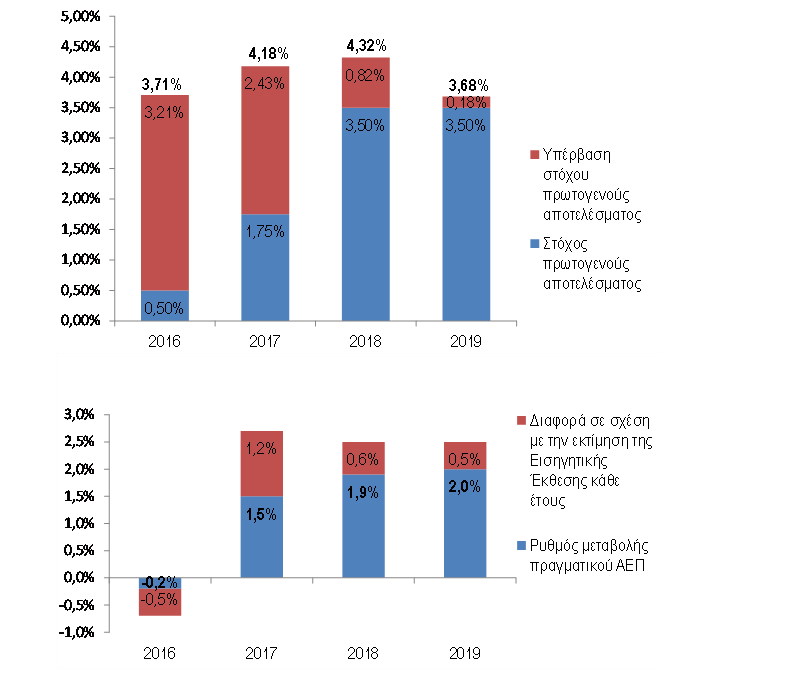 Πρωτογενές αποτέλεσμα Γενικής Κυβέρνησης έναντι των στόχων και μεταβολή του πραγματικού ΑΕΠ (2016-2019)
