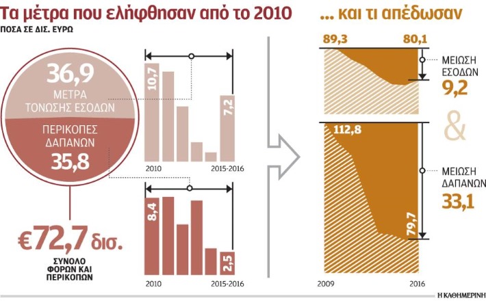 • Τα μέτρα περιστολής δαπανών το διάστημα 2010-2016 ήταν 35,8 δισ. ευρώ. Οι δαπάνες του προϋπολογισμού συρρικνώθηκαν την εν λόγω περίοδο κατά 33,1 δισ. ευρώ.