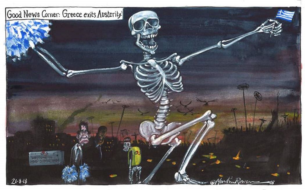 Υπό τον σαφώς ειρωνικό τίτλο «Καλά νέα: Η Ελλάδα εξέρχεται από την λιτότητα», ο σκιτσογράφος Μάρτιν Ρόουσον απεικονίζει τη χώρα μας ως έναν σκελετό που πανηγυρίζει το τέλος της μνημονιακής περιόδου, με φόντο καμένη γη αλλά και φιγούρες εξαντλημένων πολιτών, θέλοντας να τονίσει τις καταστροφικές επιπτώσεις της οκταετούς κρίσης στην ελληνική κοινωνία.