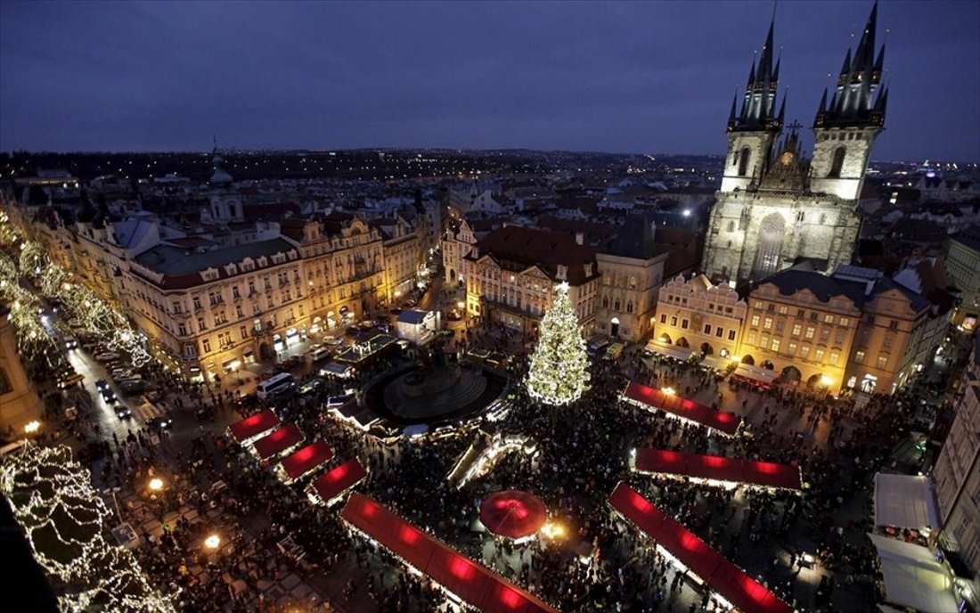 Ένα χριστουγεννιάτικο δέντρο φωτίζεται με την παραδοσιακή χριστουγεννιάτικη αγορά να ανοίγει στην πλατεία της Παλιάς Πόλης στην Πράγα.