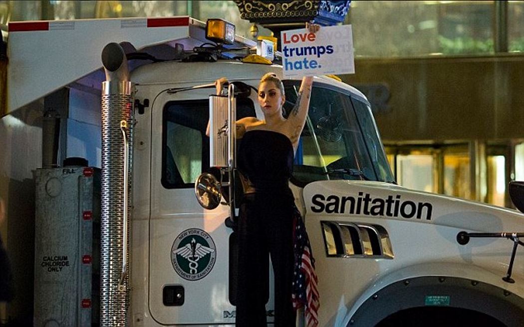 Η διάσημη τραγουδίστρια Lady Gaga πάνω σε φορτηγό, τα ξημερώματα της Τετάρτης, διαδηλώνει εναντίον της νίκης του Ντόναλντ Τραμπ, έξω από τον Trump Tower στη Νέα Υόρκη…