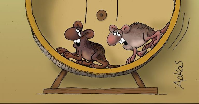Tην κατάσταση που επικρατεί διαχρονικά στην Ελλάδα, ενίοτε και στη ζωή σχολιάζει με τον δικό του τρόπο ο Αρκάς. Ο καλλιτέχνης με το καυστικό χιούμορ στο σημερινό σκίτσο του βάζει δύο ποντίκια να τρέχουν πάνω σε μια ρόδα και να σχολιάζουν: