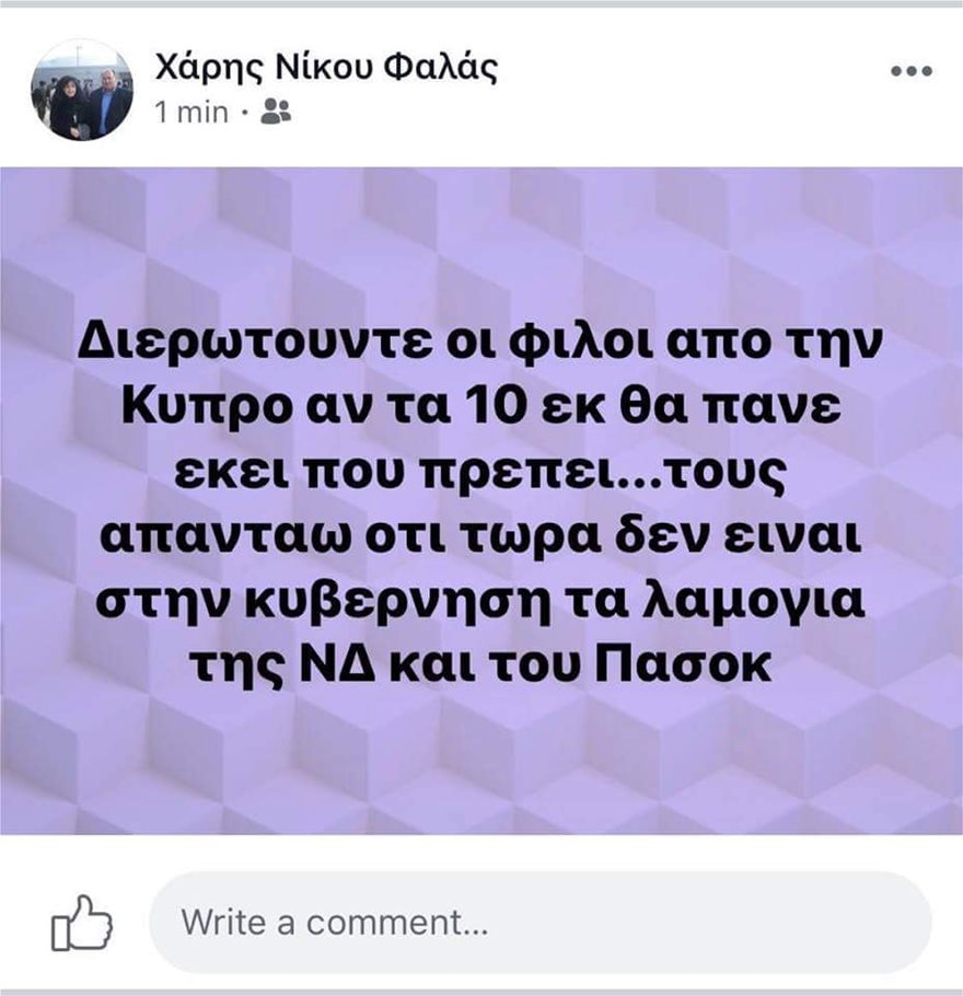 Ο κουμπάρος του υπουργού Εθνικής Άμυνας, γυμναστής στην Κύπρο και υπάλληλος της Ιεράς Μονής Κύκκου, ο οποίος διορίστηκε και έμμισθος συνεργάτης του Πάνου Καμμένου, με ανάρτηση του στο Facebook διαβεβαιώνει πως τα 10 εκατ. ευρώ που προσέφερε η κυπριακή κυβέρνηση θα πάνε σε καλή μεριά.