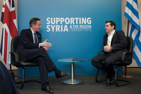 Ο κ. Τσίπρας συναντήθηκε και με τον πρωθυπουργό του Ηνωμένου Βασιλείου, Ντέιβιντ Κάμερον. Η συνάντησή τους επικεντρώθηκε στο προσφυγικό ζήτημα και συζητήθηκε η σημασία της ανάπτυξης προγραμμάτων εκπαίδευσης και απασχόλησης για τους Σύρους πρόσφυγες στις γειτονικές με τη Συρία χώρες, η οποία περιλαμβάνεται στους στόχους της Διάσκεψης Δωρητών. Υπογραμμίστηκαν, επίσης, οι προσπάθειες που καταβάλει η Ελλάδα για ανθρώπινη και αποτελεσματική διαχείριση των προσφυγικών ροών, καθώς και η αναγκαιότητα άμεσης εφαρμογής του Σχεδίου Δράσης που συμφωνήθηκε μεταξύ Ε.Ε. και Τουρκίας. Σε αυτό το πλαίσιο, συζητήθηκαν οι δυνατότητες συμβολής του Ηνωμένου Βασιλείου στη διαχείριση των προσφυγικών ροών. Επιπλέον, συζητήθηκαν το Κυπριακό, καθώς και οι διαπραγματεύσεις που διεξάγονται σχετικά με την παραμονή του Ηνωμένου Βασιλείου στην Ευρωπαϊκή Ένωση.