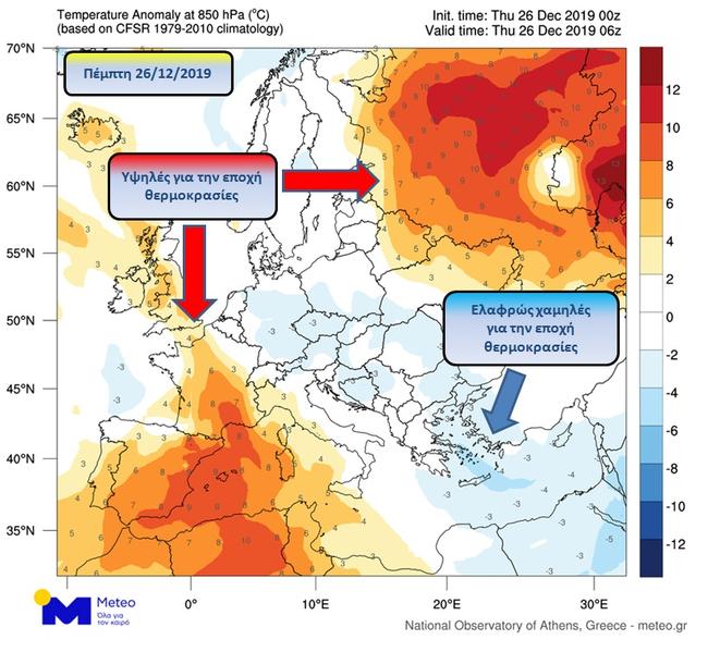 Περαιτέρω σημαντική πτώση της θερμοκρασίας (έως και δέκα βαθμούς κάτω από τις κλιματικές τιμές) αναμένεται τις επόμενες ημέρες, η οποία σχετίζεται με την κακοκαιρία «Ζηνοβία» και τις αρκτικές αέριες μάζες που θα τη συνοδεύουν. Αντίθετα, όπως συνηθίζεται σε περιπτώσεις ψυχρών εισβολών στη χώρα μας, στη Δυτική και στη Βόρεια Ευρώπη θα επικρατήσουν πολύ θερμές αέριες μάζες, έως και δέκα βαθμούς πάνω από τις κλιματικές τιμές.
