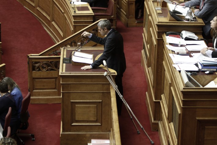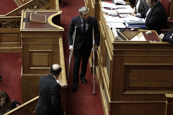 Έτσι, σήμερα το πρωί εμφανίστηκε με πατερίτσες στην αίθουσα της Ολομέλειας.