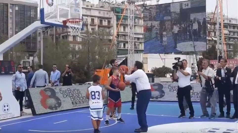 Ο κ. Τσίπρας επισκέφθηκε το γήπεδο μπάσκετ που έχει στηθεί στο χώρο, όπου ήδη έπαιζαν δύο μικροί αθλητές. Κάποια στιγμή αποφάσισε να πάρει ο ίδιος την μπάλα και να στοχεύσει.