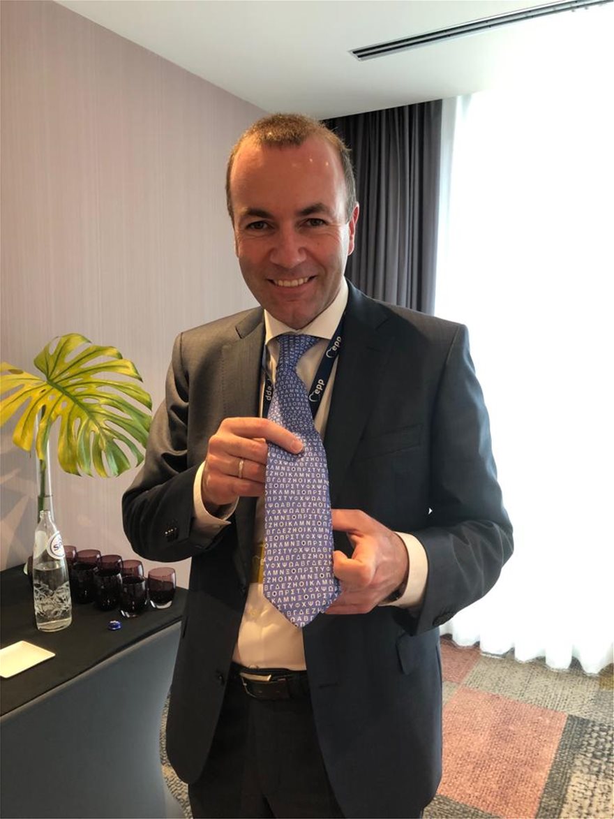 Με ελληνική γραβάτα εμφανίστηκε ο υποψήφιος του Ευρωπαϊκού Λαϊκού Κόμματος για την προεδρία της Ευρωπαϊκής Επιτροπής, Μάνφρεντ Βέμπερ, στα γραφεία της ΕΛΚ.  Ο κ. Βέμπερ θέλησε με αυτό τον τρόπο να τιμήσει την επέτειο της ένταξης της Ελλάδος στην ΕΟΚ το 1979.