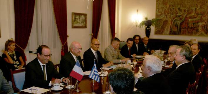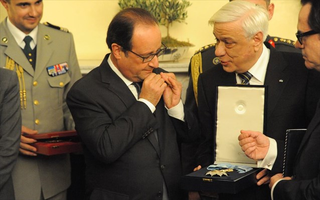 - Θα ακολουθήσει ημίωρη συνάντηση των δυο Προέδρων στο Προεδρικό Μέγαρο και αμέσως μετά διευρυμένες συνομιλίες των δυο αντιπροσωπειών, και στη συνέχεια τελετή παρασημοφόρησης του Γάλλου Προέδρου Ολάντ από τον Προκόπη Παυλόπουλο.