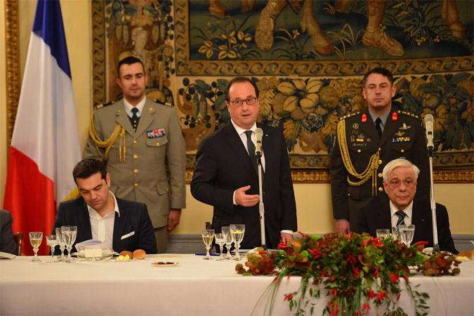 Την ανάγκη να υπάρξει πρόοδος σε ό,τι αφορά το χρέος υπογράμμισε ο Γάλλος Πρόεδρος Φρανσουά Ολάντ κατά τον χαιρετισμό του στο επίσημο δείπνο που παραθέτει ο Πρόεδρος της Δημοκρατίας Προκόπης Παυλόπουλος, ενώ τόνισε ότι οι μεταρρυθμίσεις θα πρέπει να στραφούν προς την ανάπτυξη. Ιδιαίτερα θερμή ήταν η αναφορά του στον πρωθυπουργό Αλέξη Τσίπρα καθώς τόνισε ότι με την επιμονή του και το κουράγιο του υπήρξε θετική κατάληξη στις διαπραγματεύσεις.