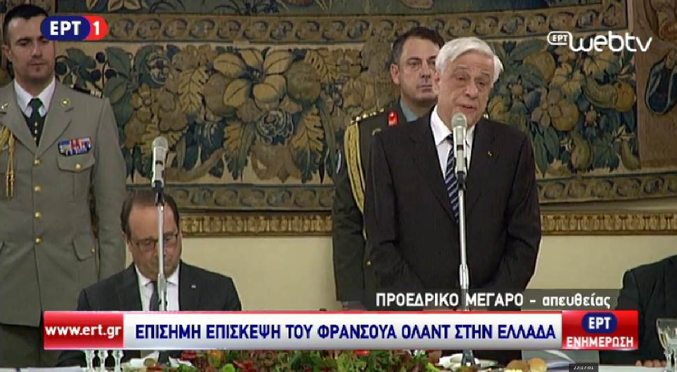 Το θέμα του χρέους, των συνεχιζόμενων πολιτικών λιτότητας, την επιθυμία των Ελλήνων να παραμείνουν στη ζώνη του ευρώ, αλλά και τα λάθη των δανειστών έθεσε ο Πρόεδρος της Δημοκρατίας, Προκόπης Παυλόπουλος, προς τον πρόεδρο της Γαλλικής Δημοκρατίας, Φρανσουά Ολάντ, στην προσφώνησή του κατά το επίσημο δείπνο στο προεδρικό μέγαρο.