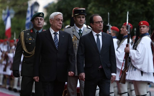 Στο Προεδρικό Μέγαρο έφτασε ο Γάλλος πρόεδρος Φρανσουά Ολάντ όπου έλαβε μέρος επίσημη τελετή υποδοχής του από τον Πρόεδρο Προκόπη Παυλόπουλο. Παρόντες ήταν επίσης ο Πρόεδρος της Βουλής Νίκος Βούτσης, ο υπουργός Παιδείας Νίκος Φίλης, και ο υπουργός Οικονομικών Ευκλείδης Τσακαλώτος. Οι κ.κ. Ολάντ και Παυλόπουλος θα έχουν κατ’ ιδίαν συνάντηση και θα ακολουθήσει ευρεία σύσκεψη με τις αντιπροσωπείες.