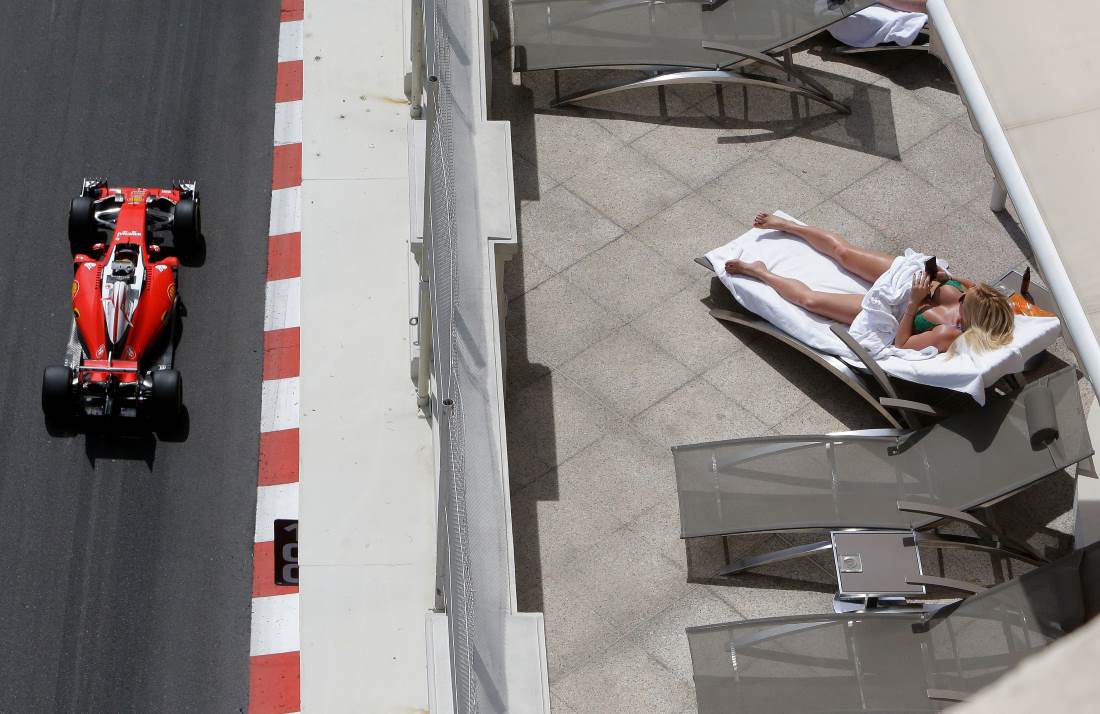 Ο πιλότος της Ferrari Sebastian Vettel, δοκιμάζει το μονοθέσιο κατά τα ελεύθερα δοκιμαστικά για το Grand Prix του Μονακό, αλλά η κυρία στο μπαλκόνι δεν ενδιαφέρεται… Προτιμά την ηλιοθεραπεία και το smartphone της από τον Γερμανό πιλότο. Ο αγώνας στο Πριγκιπάτο είναι την Κυριακή