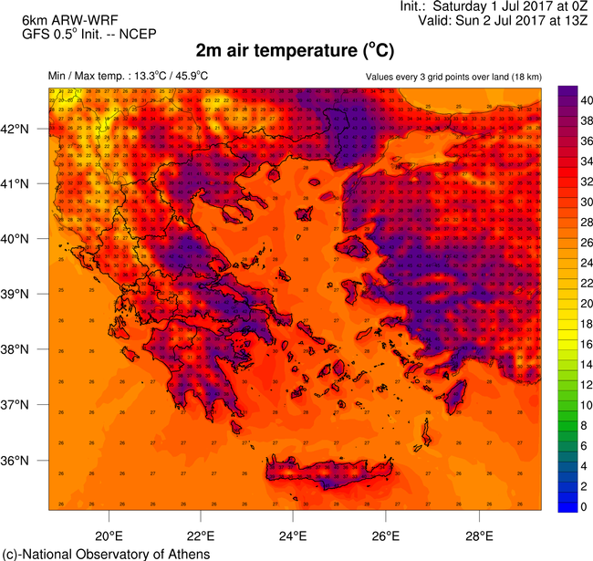 Ακόμη και στους 45 βαθμούς θα «σκαρφαλώσει» την Κυριακή ο υδράργυρος στην κοιλάδα του Έβρου, στη Θεσσαλική πεδιάδα, καθώς και σε περιοχές της Βοιωτίας, της Αττικής και της Πελοποννήσου.