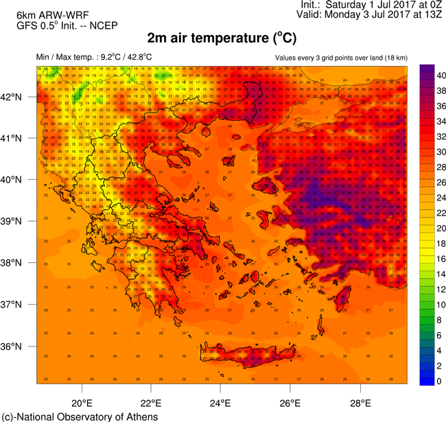 Σήμερα Σαββάτο οι περισσότερες πεδινές ηπειρωτικές αλλά και κάποιες νησιωτικές περιοχές θα φτάσουν τους 40 με 41 βαθμούς, ενώ στη κοιλάδα του Έβρου, στη Θεσσαλική πεδιάδα, καθώς και σε περιοχές της Βοιωτίας, της Αττικής, της Πελοποννήσου, και της Νότιας Κρήτης οι μέγιστες θα φτάσουν κατά τόπους έως και τους 43 με 44 βαθμούς.