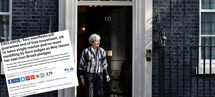 Η Τερέζα Μέι θα δεσμευτεί επισήμως εν όψει των πρόωρων εκλογών της 8ης Ιουνίου ότι θα σταματήσει η ελεύθερη μετακίνηση πολιτών της Ε.Ε. προς τη Βρετανία, σύμφωνα με δημοσίευμα της Daily Mail, η οποία επικαλείται πηγές του Συντηρητικού Κόμματος.