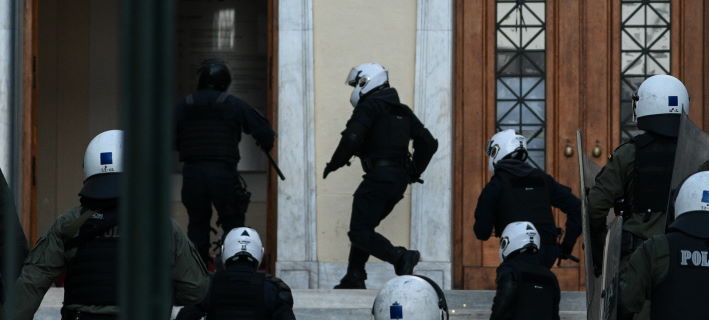 Eξοπλισμένα με κουκούλες και ρόπαλα μπήκαν στην ΑΣΟΕΕ και πετούν πέτρες, ξύλα κι άλλα αντικείμενα στους αστυνομικούς οι οποίοι απαντούν με χρήση χημικών.