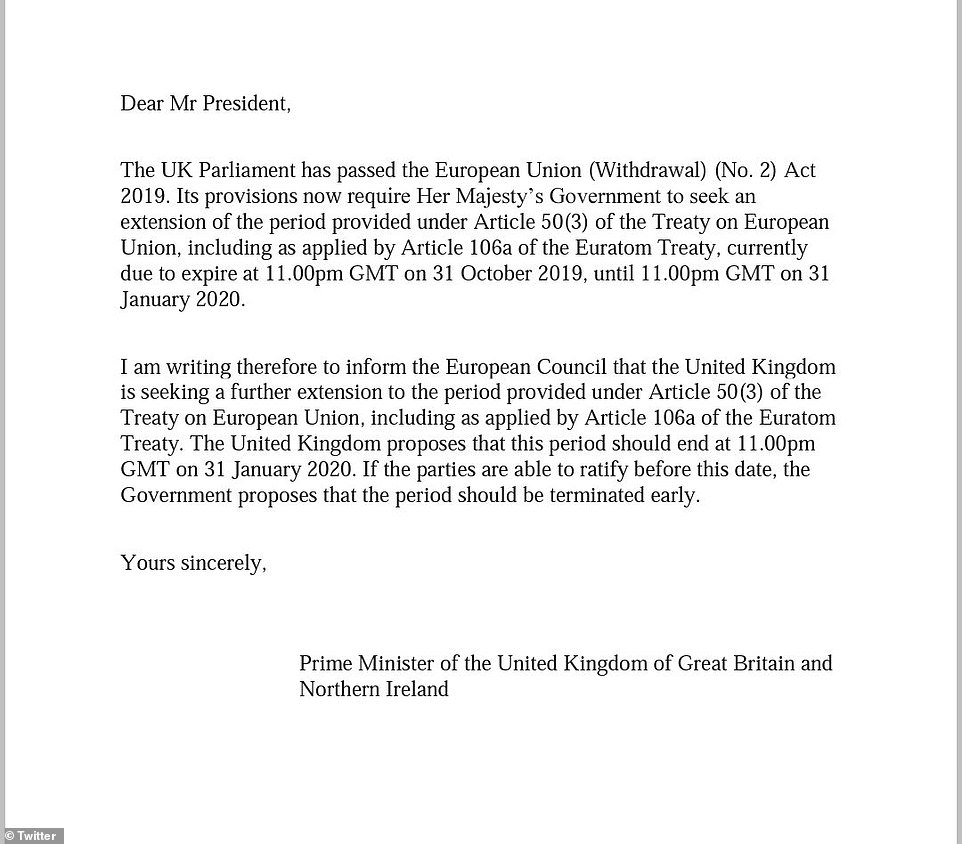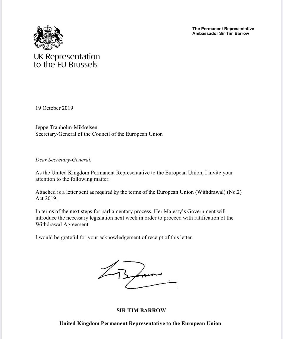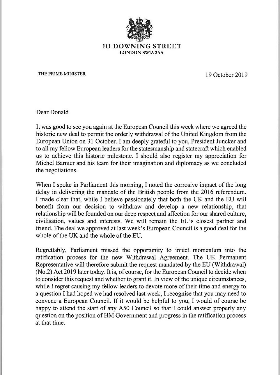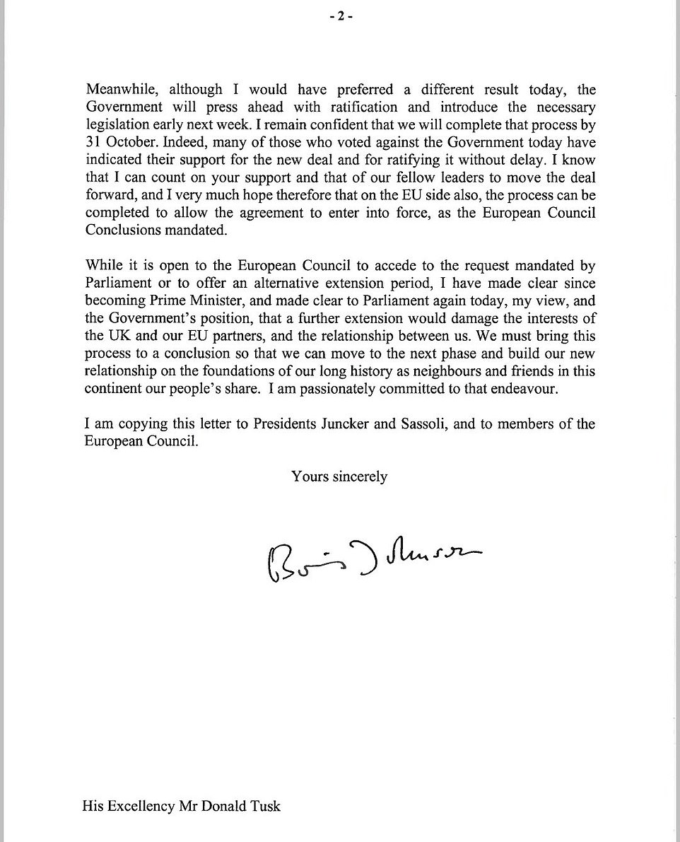 Όπως διευκρίνισε μια κυβερνητική πηγή, ο Τζόνσον έστειλε τρεις επιστολές: Ένα ανυπόγραφο αντίγραφο του αιτήματος για αναβολή – το οποίο ήταν υποχρεωμένος, βάσει του νόμου Μπεν, να στείλει – ένα διευκρινιστικό έγγραφο του μόνιμου αντιπροσώπου του Ηνωμένου Βασιλείου στην ΕΕ και μια επιστολή στην οποία εξηγεί γιατί η Ντάουνγκ Στριτ δεν θέλει μια παράταση του Brexit.