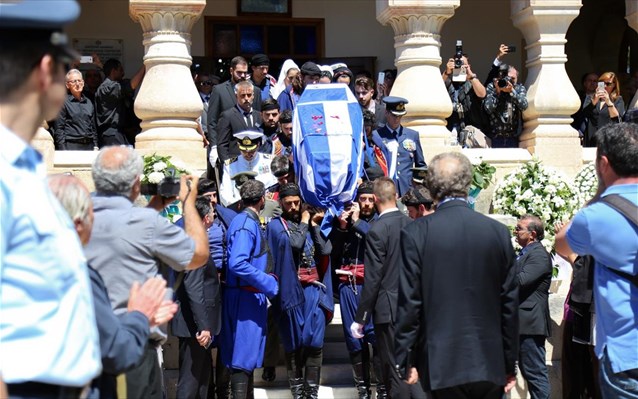 Με μαντινάδες και κρητική λύρα είπαν το τελευταίο αντίο στον εκλιπόντα οι κρητικοί καλλιτέχνες Μανώλης Κονταρός και Νίκος Ζωιδάκης. «Σήκω επάνω αρχηγέ που πάς αυτή την ώρα» τραγούδησαν εν μέσω χειροκροτημάτων οι δύο καλλιτέχνες.