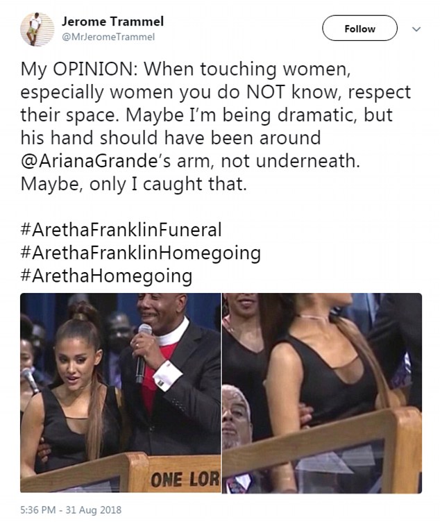Όπως ισχυρίστηκε αγκάλιασε όλους τους καλλιτέχνες κατά τη διάρκεια της κηδείας της Αρέθα Φράνκλιν. «Ποτέ δεν θα ήθελα να αγγίξω το στήθος κάθε γυναίκας… Δεν ξέρω, γιατί έβαλα το χέρι μου γύρω της, μάλλον ξεπέρασα τα όρια…”, δικαιολογήθηκε ο πάστορας, αργότερα όταν τα κοινωνικά μέσα πήραν φωτιά και το hashtag #RespectAriana, έγινε viral με το σχετικό βίντεο να πάιζει συνεχώς.