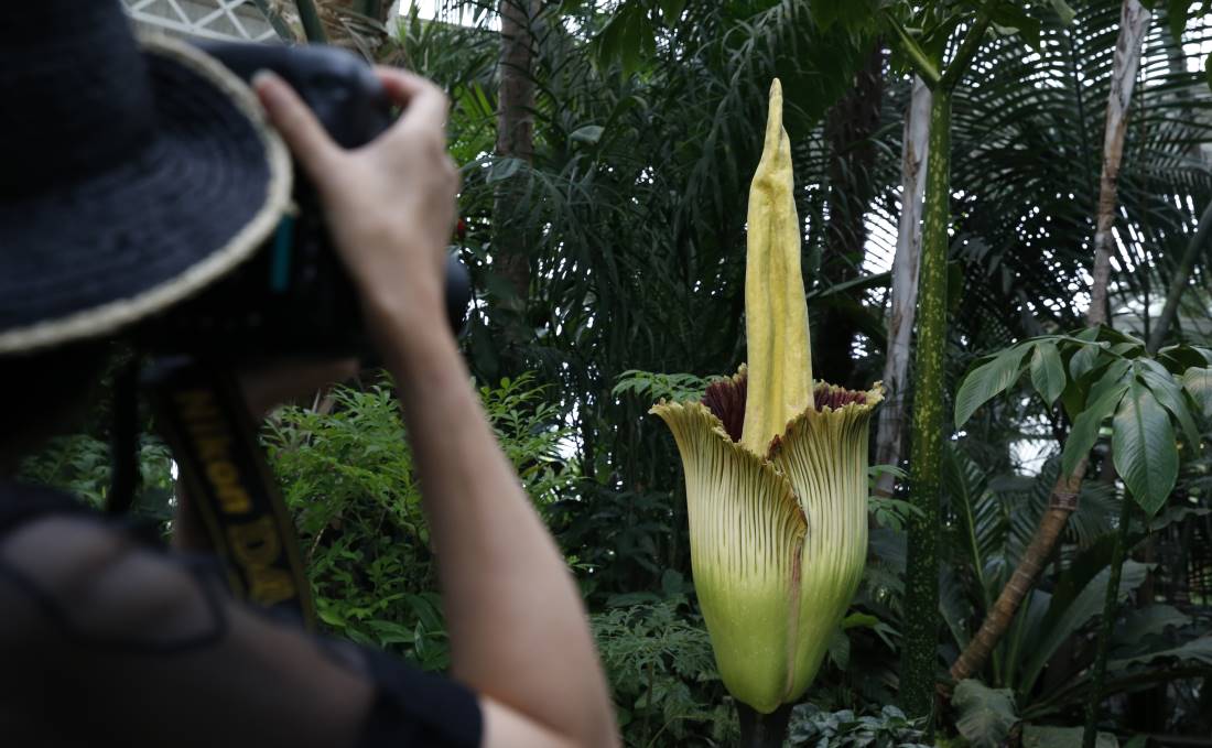 Επισκέπτης παίρνει φωτογραφίες του λουλουδιού Titanum Amorphophallus που αρχίζει να ανθίζει στο New York Botanical Garden, στη Νέα Υόρκη. Οι σπάνιο φυτό απελευθερώνει μια μυρωδιά κατά τη διάρκεια της σύντομης ανθοφορίας του – από 24 έως 36 ώρες – όπως της σάπιας σάρκας. Αυτός είναι και ο λόγος που ονομάζεται “φυτό-πτώμα”. Είναι η πρώτη φορά, από το 1939, ανθίζει ένα Titanum Amorphophallus
