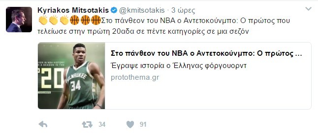Τον θαυμασμό του για τα επιτεύγματα του Έλληνα μπασκεμπολίστα Γιάννη Αντετοκούνμπο εξέφρασε ο πρόεδρος της ΝΔ Κυριάκος Μητσοτάκης. Ο κ. Μητσοτάκης έγραψε στον προσωπικό λογαριασμό του στο Twitter: