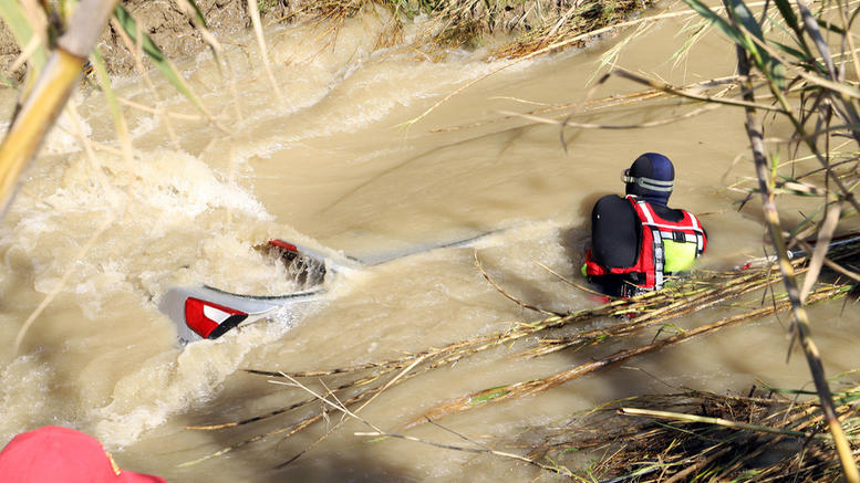 Το όχημα εντοπίστηκε ένα χιλιόμετρο μακριά από το σημείο που είχε παρασυρθεί από τα ορμητικά νερά του Γεροπόταμου και είναι καλυμμένο με νερό, λάσπη και καλαμιές.