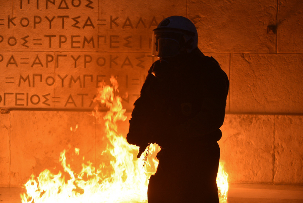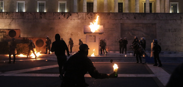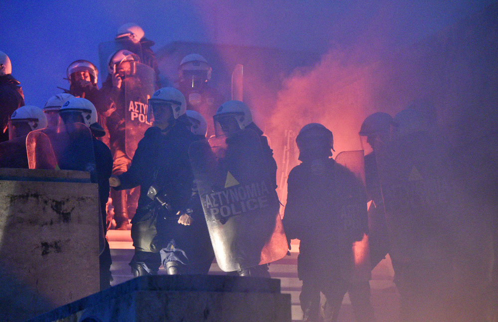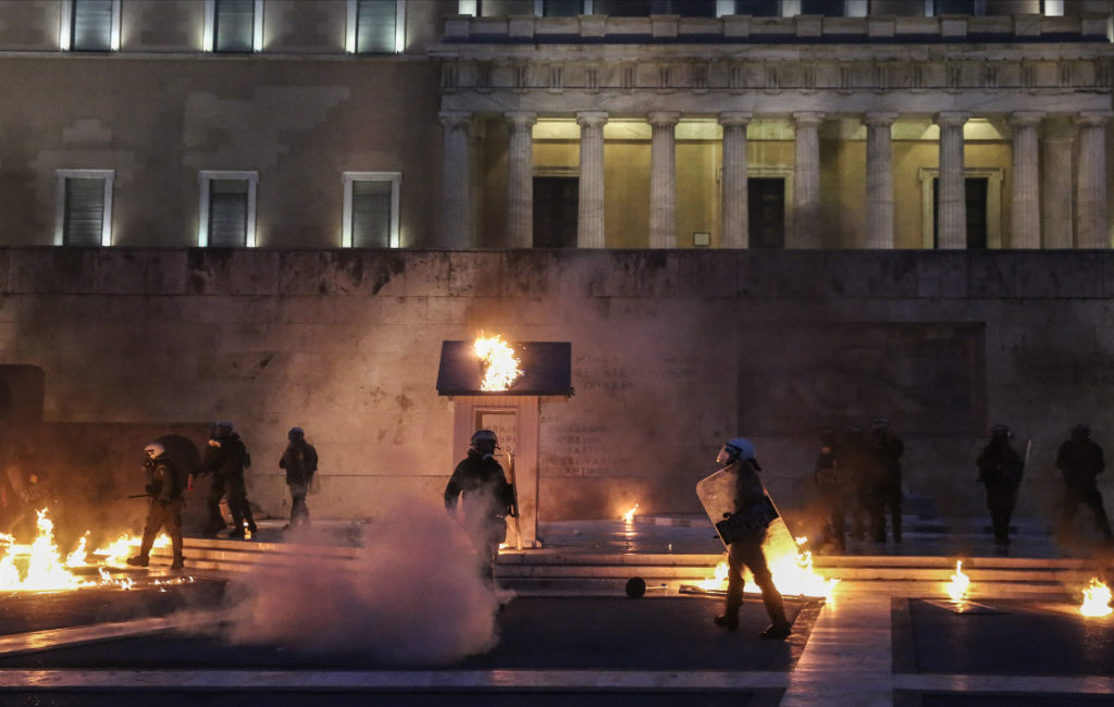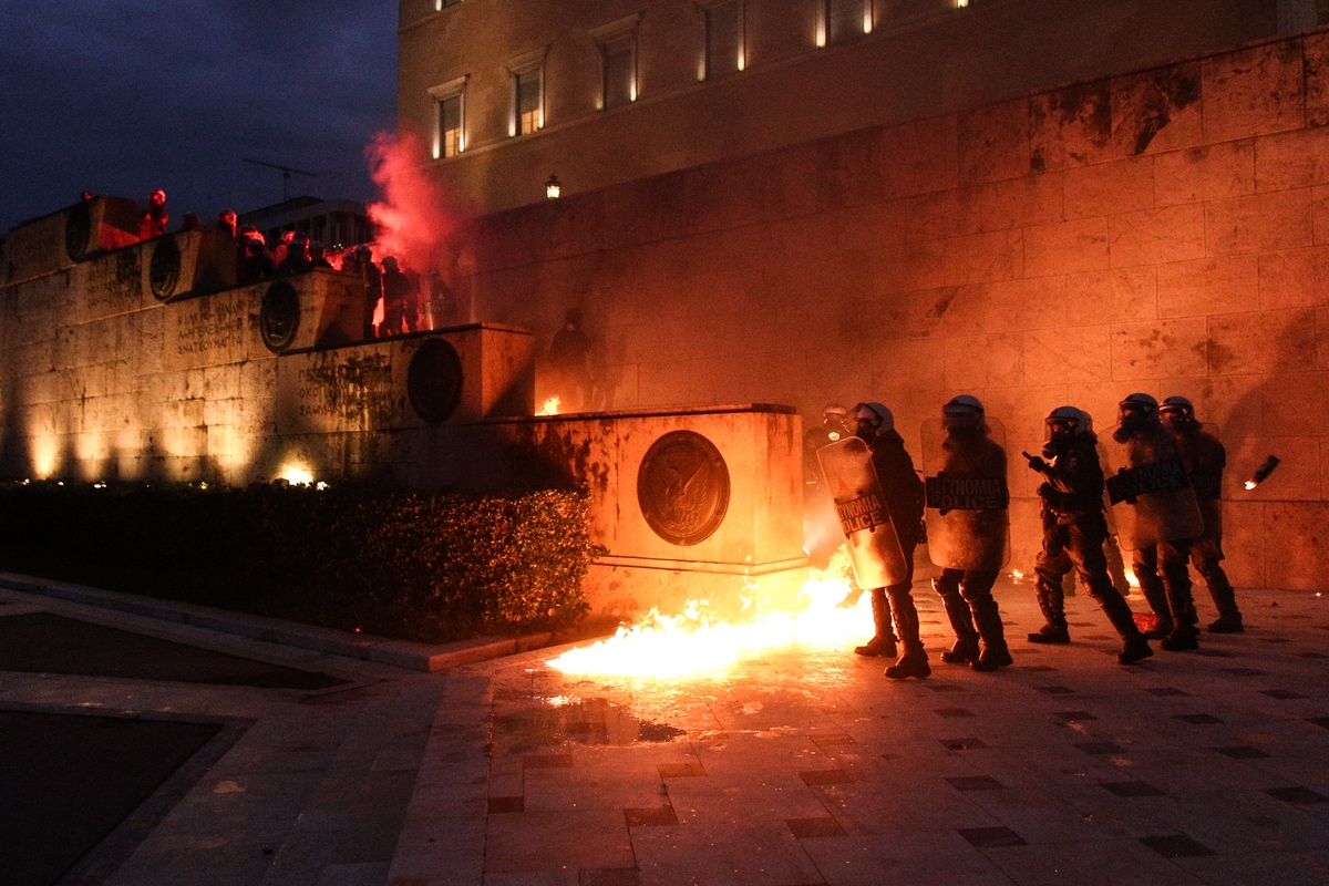 Οι αντιεξουσιαστές έκαναν τέσσερα «ντου» επιτιθέμενοι στα ΜΑΤ έξω από τη Βουλή. Οπλισμένοι με… σφυριά, τσεκούρια, πέτρες και μολότοφ προκάλεσαν χάος. Πυρπόλησαν το φυλάκιο μπροστά από τον Αγνωστο Στρατιώτη και συγκρούστηκαν με τις αστυνομικές δυνάμεις που απάντησαν με δακρυγόνα.