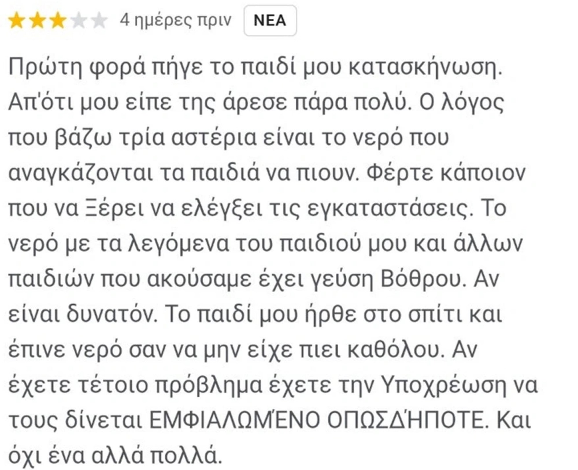 Ένας άλλος γονέας , σε σχόλιο – κριτική στο Google διαμαρτυρήθηκε για το νερό που καταναλώνουν τα παιδιά. Γράφει χαρακτηριστικά: