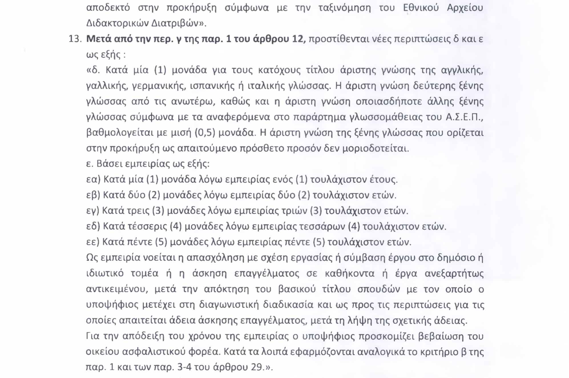 Παράλληλα ο κ. Βορίδης προχώρησε με νομοτεχνική αλλαγή σε έξτρα μοριοδότηση για την αναγνώριση εργασιακής εμπειρίας τόσο στο δημόσιο όσο και στον ιδιωτικό τομέα. Υπενθυμίζεται ότι και οι δύο ρυθμίσεις αποτέλεσαν παρατήρηση αρκετών εκ των συμμετεχόντων στη διαδικασία της δημόσιας διαβούλευσης.
