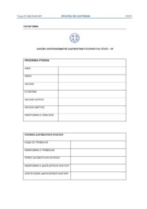 - Η δήλωση αποτελέσματος πραγματοποιείται στην ηλεκτρονική πλατφόρμα self-testing.gov.gr με την συμπλήρωση του ειδικού ηλεκτρονικού εντύπου «Δήλωση Αποτελέσματος Διαγνωστικού Ελέγχου για COVID – 19».