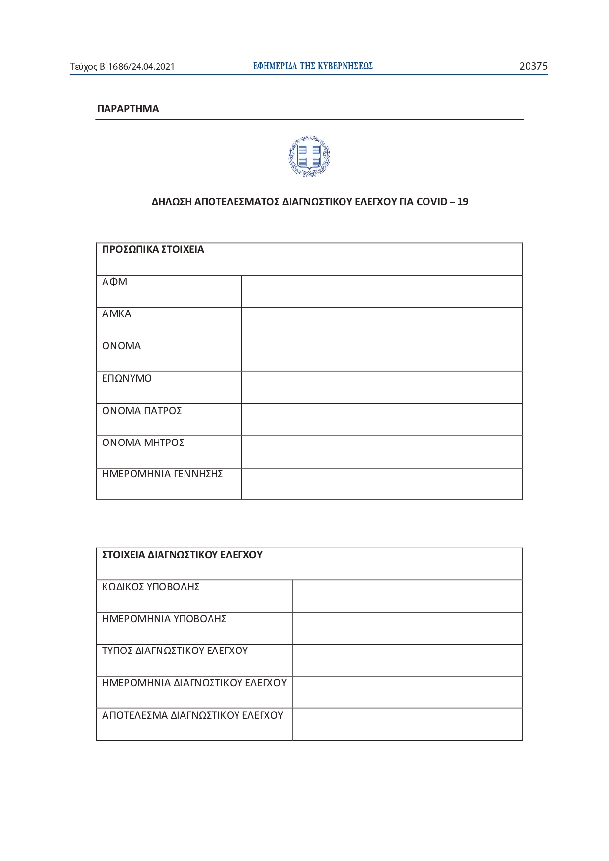 - Κατά την πρώτη εφαρμογή του συγκεκριμένου μέτρου, δηλαδή από την 26η Απριλίου έως την 9η Μαΐου 2021, οι εργαζόμενοι που είναι υπόχρεοι σε διαγνωστικό έλεγχο δύνανται να υποβάλλονται και να δηλώνουν στη σχετική ηλεκτρονική πλατφόρμα το αποτέλεσμα του διαγνωστικού ελέγχου νόσησης από τον κορωνοϊό εντός του χρονικού διαστήματος από 26 Απριλίου έως και 9 Μαΐου 2021.