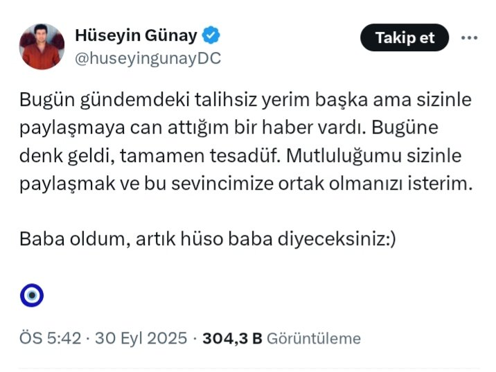 Σε δήλωσή του μέσω του λογαριασμού του στην πλατφόρμα κοινωνικής δικτύωσης Χ, ο Hüseyin Günay, πριν την απόλυσή του ανέφερε: «Η άτυχη θέση μου στην επικαιρότητα σήμερα είναι διαφορετική, αλλά υπήρχαν νέα που ανυπομονούσα να μοιραστώ μαζί σας. Έτυχε να συμπέσουν με τη σημερινή ημέρα, εντελώς τυχαία. Θέλω να μοιραστώ την ευτυχία μου μαζί σας και θέλω να μοιραστείτε κι εσείς αυτή τη χαρά. Έγινα πατέρας, από εδώ και πέρα θα με αποκαλείτε Hüso Baba».