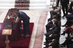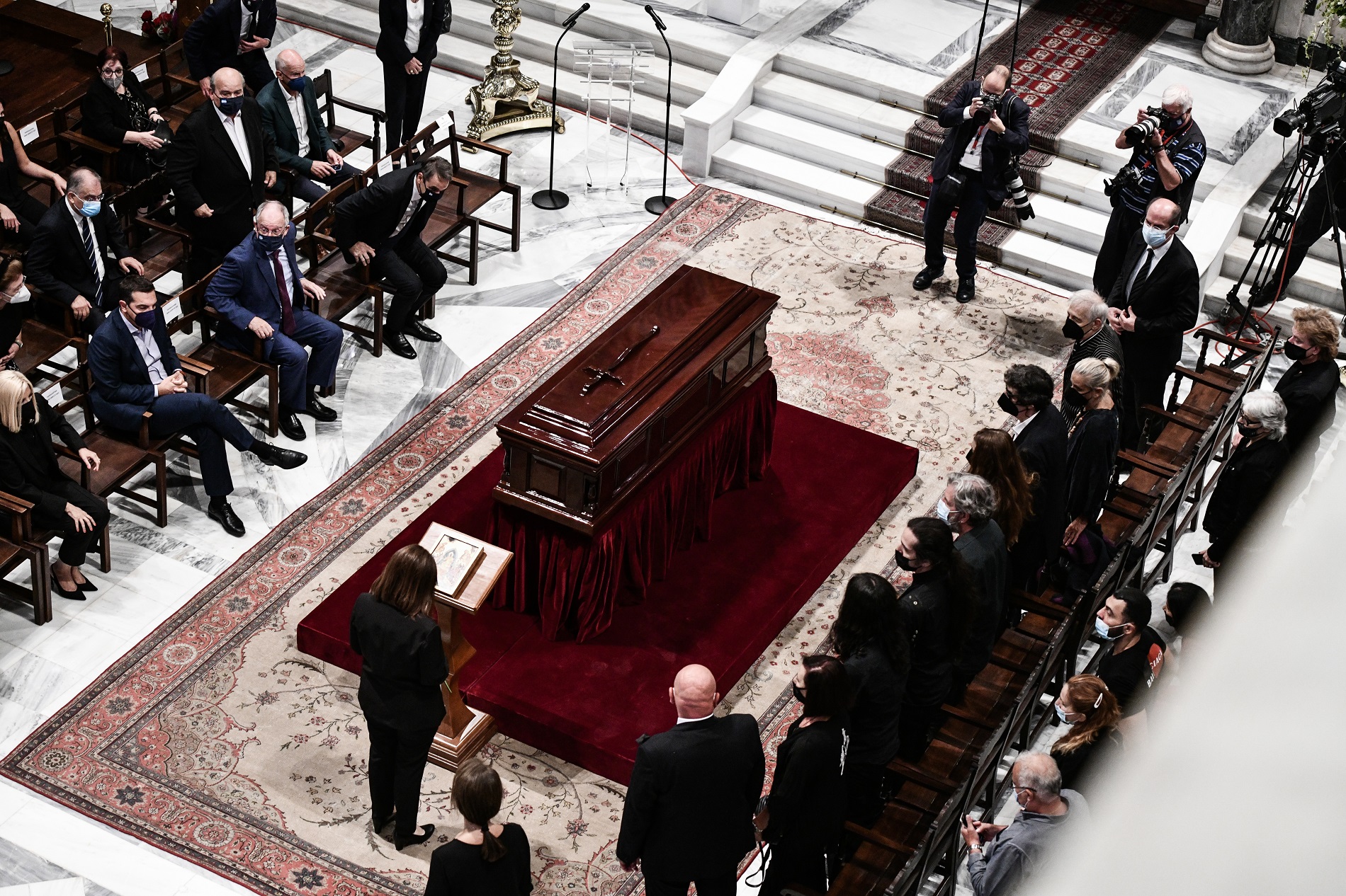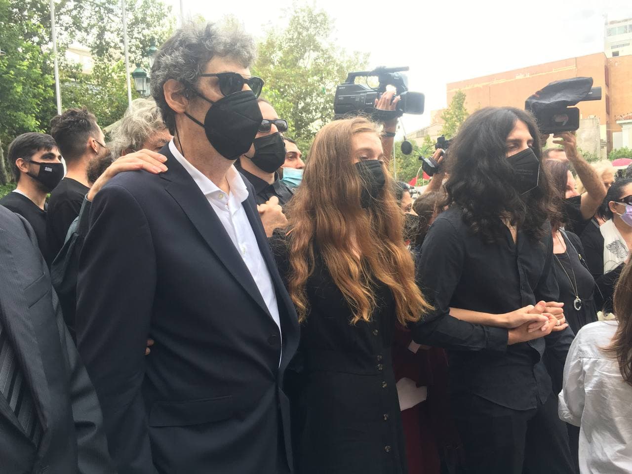 Η οικογένεια του μεγάλου δημιουργού καθόταν σύσσωμη στο πλάι της σορού του, ωστόσο ούτε ο φωτογραφικός φακός αλλά ούτε και οι τηλεοπτικές κάμερες απαθανάτισαν πουθενά τη Μαργαρίτα Θεοδωράκη.