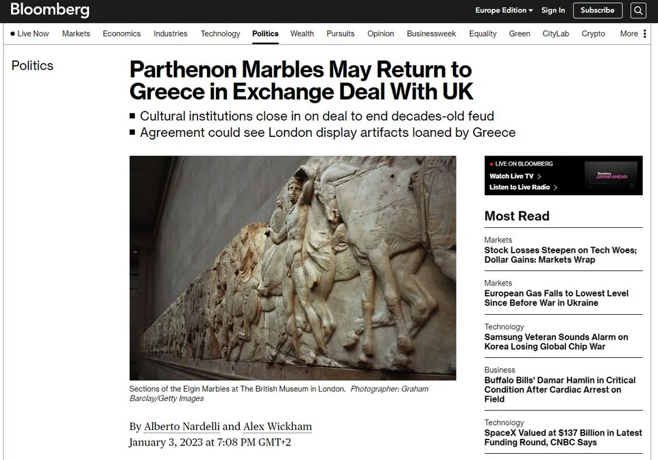 Δεν ισχύει το δημοσίευμα του Bloomberg ότι το Βρετανικό Μουσείο και το Μουσείο Ακρόπολης βρίσκονται κοντά σε συμφωνία που θα ανοίξει τον δρόμο για τη σταδιακή επιστροφή των Γλυπτών του Παρθενώνα στην Ελλάδα στο πλαίσιο μιας πολιτιστικής ανταλλαγής, αναφέρουν πηγές του Υπουργείου Πολιτισμού και Αθλητισμού.