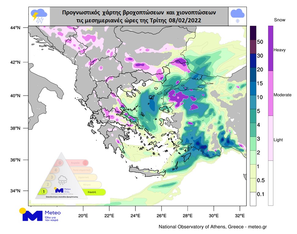 Στους παρακάτω χάρτες, παρουσιάζεται η γεωγραφική κατανομή των φαινομένων που θα εκδηλώνονται τις μεσημεριανές και πρώτες βραδινές ώρες της Τρίτης 08/02. Με μπλε-πράσινες αποχρώσεις απεικονίζονται οι βροχοπτώσεις και με ροζ αποχρώσεις οι χιονοπτώσεις.