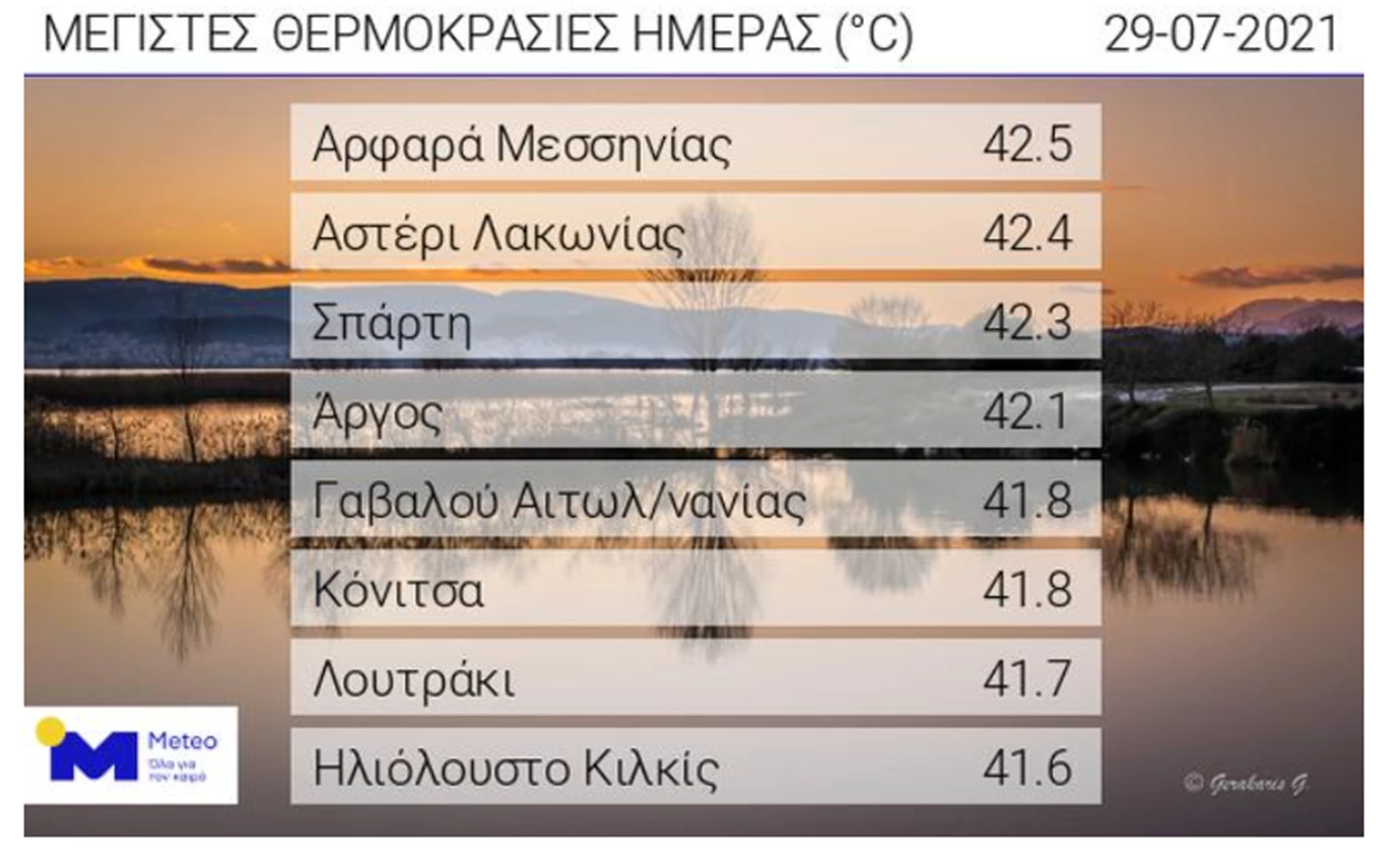 Με εξαίρεση τις Κυκλάδες και τα νησιά του Βορείου Αιγαίου, σε όλα τα υπόλοιπα γεωγραφικά διαμερίσματα της χώρας το θερμόμετρο ξεπέρασε τους 40 βαθμούς Κελσίου, σε 8 γεωγραφικά διαμερίσματα και 63 μετεωρολογικούς σταθμούς.
