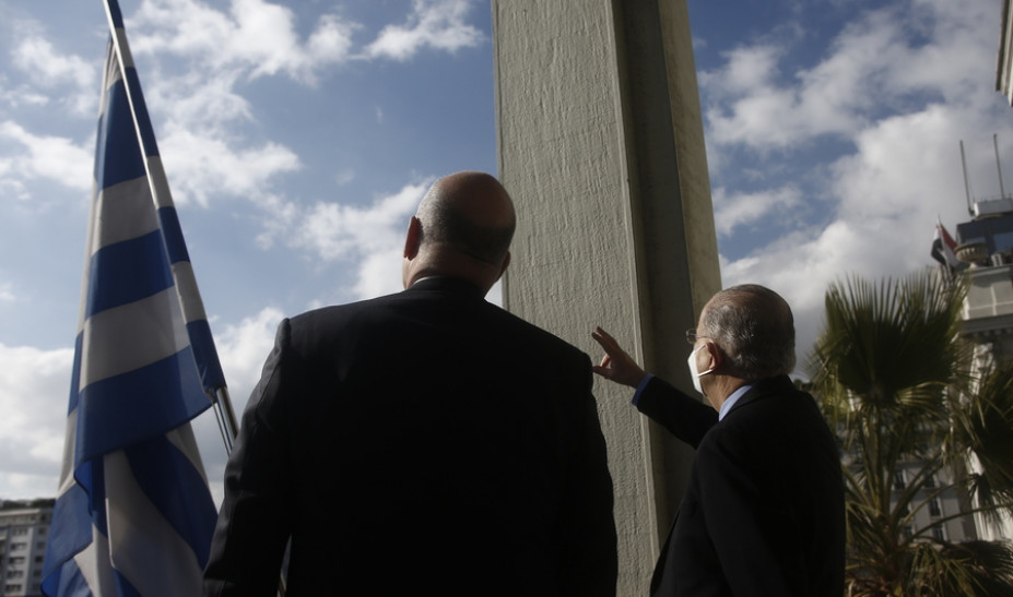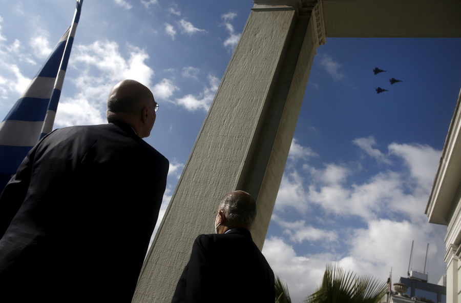 Η διέλευση των έξι πρώτων Rafale που παρέλαβε η Πολεμική Αεροπορία «διέκοψε» τη συνάντηση του υπουργού Εξωτερικών, Νίκου Δένδια με τον υπουργό Εξωτερικών της Κυπριακής Δημοκρατίας, Ιωάννη Κασουλίδη. Οι δύο υπουργοί βγήκαν στο μπαλκόνι και παρακολούθησαν τη διέλευση των έξι νέων μαχητικών αεροσκαφών Rafale πάνω από την Ακρόπολη.