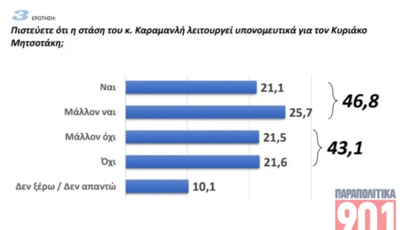 To 46,8% των ερωτηθέντων πιστεύει ότι η στάση του Κώστα Καραμανλή λειτουργεί υπονομευτικά για τον Κυριάκο Μητσοτάκη ενώ αντίθετη γνώμηη εκφράζει το 43,1%.