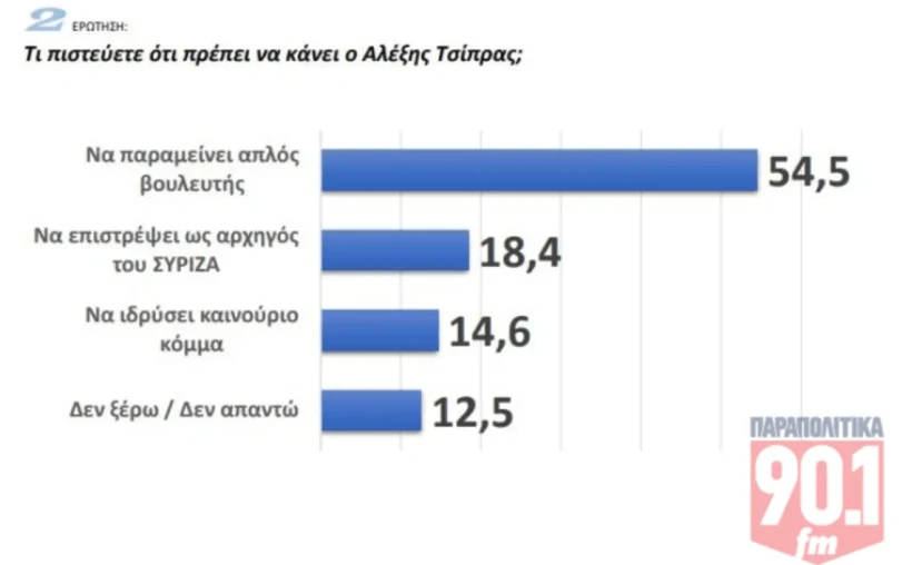 Στη δημοσκόπηση της GPO για το ραδιόφωνο των Παραπολιτικών οι πολίτες ως προς ο πολιτικό μέλλον του Αλέξη Τσίπρα σε ποσοστό 54,5% πιστεύουν ότι πρέπει να παραμείνει απλός βουλευτής. Να επιστρέψει ως αρχηγός του ΣΥΡΙΖΑ λέει το 18,4%, να ιδρύσει νέο κόμμα το 14,6%.