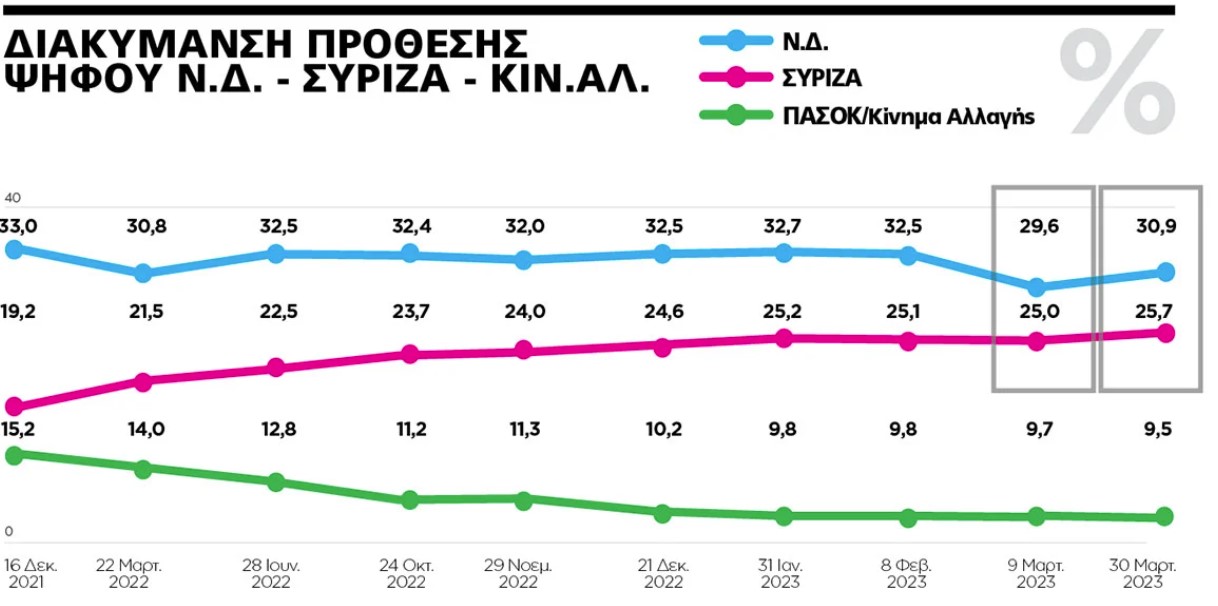 Η κυβερνητική παράταξη φαίνεται να περνά σε φάση ανάκτησης των απωλειών τις οποίες κατέγραψε αμέσως μετά το πολύνεκρο σιδηροδρομικό δυστύχημα στα Τέμπη καθώς ενισχύει το προβάδισμά της έναντι της αξιωματικής αντιπολίτευσης και μπαίνει με σημαντικά ποιοτικά και ποσοτικά πλεονεκτήματα στην τελική ευθεία προς την κάλπη της 21ης Μαΐου.