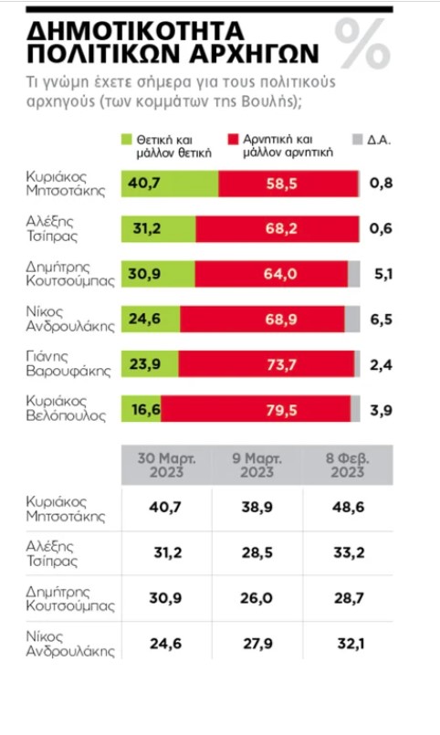 Ο Κυριάκος Μητσοτάκης είναι εξάλλου ο δημοφιλέστερος μεταξύ των πολιτικών αρχηγών, αν και η εικόνα του επλήγη μετά την τραγωδία των Τεμπών. Από 48,6% θετικές γνώμες που είχε τον Φεβρουάριο, στις αρχές Μαρτίου υποχώρησε στο 38,9% και τώρα βρίσκεται στο 40,7%. Τον χωρίζουν 9,5 μονάδες από τον Αλέξη Τσίπρα, που ανέβηκε στο 31,2, αλλά υπολείπεται και πάλι από το 33,2% που είχε τον Φεβρουάριο. Ανατροπή εμφανίζεται στην τρίτη θέση, καθώς ο Δημήτρης Κουτσούμπας καταγράφει άνοδο σχεδόν 5 μονάδων που τον οδηγούν στο 30,9%. Πτωτικά κινείται αντιθέτως η δημοφιλία του Νίκου Ανδρουλάκη, ο οποίος με 24,6% πέρασε τέταρτος και τον πλησίασε αρκετά ο Γιάνης Βαρουφάκης που έφτασε στο 23,9%. Την εξάδα συμπληρώνει ο Κυριάκος Βελόπουλος με 16,6%.