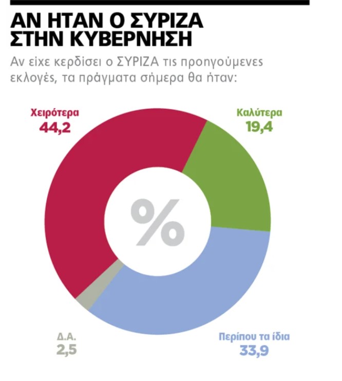 Την ίδια ώρα πάντως φαίνεται ότι η απογοήτευση των πολιτών από τη διακυβέρνηση του ΣΥΡΙΖΑ δεν έχει υποχωρήσει. Το 44,2% των ερωτηθέντων πιστεύει ότι τα πράγματα θα ήταν σήμερα χειρότερα αν το 2019 είχε κερδίσει τις εκλογές το κόμμα του Αλέξη Τσίπρα. Οτι θα ήταν περίπου τα ίδια εκτιμά το 33,9%, ενώ στο 19,4% περιορίζονται εκείνοι που νοσταλγούν την «πρώτη φορά Αριστερά», πιστεύοντας ότι θα ήμασταν σε καλύτερη κατάσταση αν είχε ανανεωθεί η θητεία του ΣΥΡΙΖΑ.