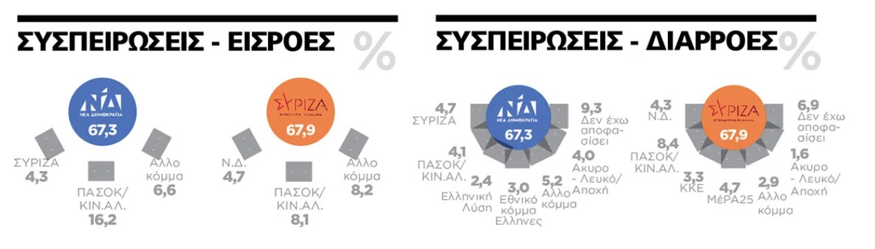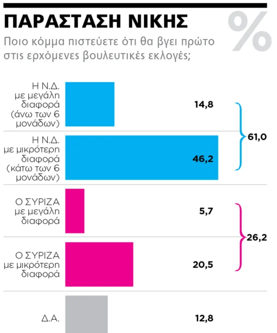 Υπό αυτές τις συνθήκες δεν προκαλεί έκπληξη το γεγονός ότι ενώ τα δύο μεγαλύτερα κόμματα είναι σχεδόν ισοδύναμα στη συσπείρωση των παλαιών τους ψηφοφόρων (67,3% η Ν.Δ. και 67,9% ο ΣΥΡΙΖΑ), η κυβερνητική παράταξη εμφανίζεται να έχει τεράστια απόσταση στη λεγόμενη «παράσταση νίκης», δηλαδή στην πεποίθηση των συμμετεχόντων στην έρευνα για το κόμμα που θα κόψει πρώτο το νήμα της κάλπης.